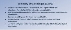 The sale of business assets, which qualify for Business Asset Disposal Relief (BADR) will now attract a rate of 18% on gains, an increase of 4% on the rate which applied in 2025/26 and significantly above the 10% level which applied before 2025. The lifetime limit for capital gains which qualify for BADR remains at £1m in the new tax year.